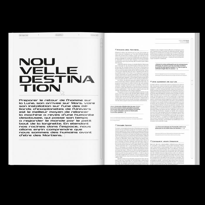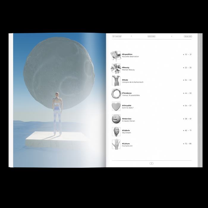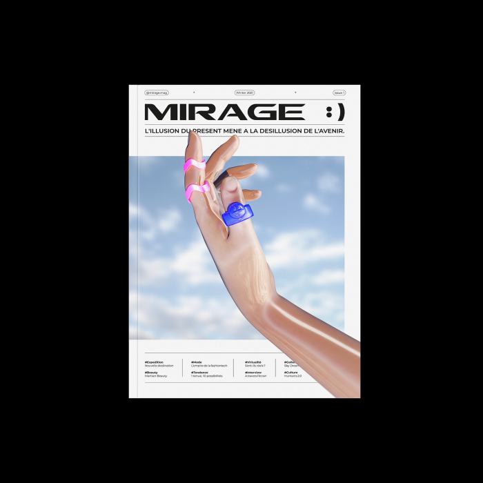 Avant de vous évader pour Mars, lisez le magazine fictif Mirage. Entre rêves, virtualité et réalité, Mirage s’intéresse à la conquête spatiale, à la mode de demain, aux réseaux sociaux, au progrès technologique et au mouvement du transhumanisme. Ce magazine vous transportera dans son univers onirique et futuriste avec des images 3D, des photographies personnelles ainsi qu’une mise en page inspirée du web. Mirage vous ouvrira les yeux sur l’illusion que l’avenir vous tend, tout en espérant vous offrir un moment d’évasion.