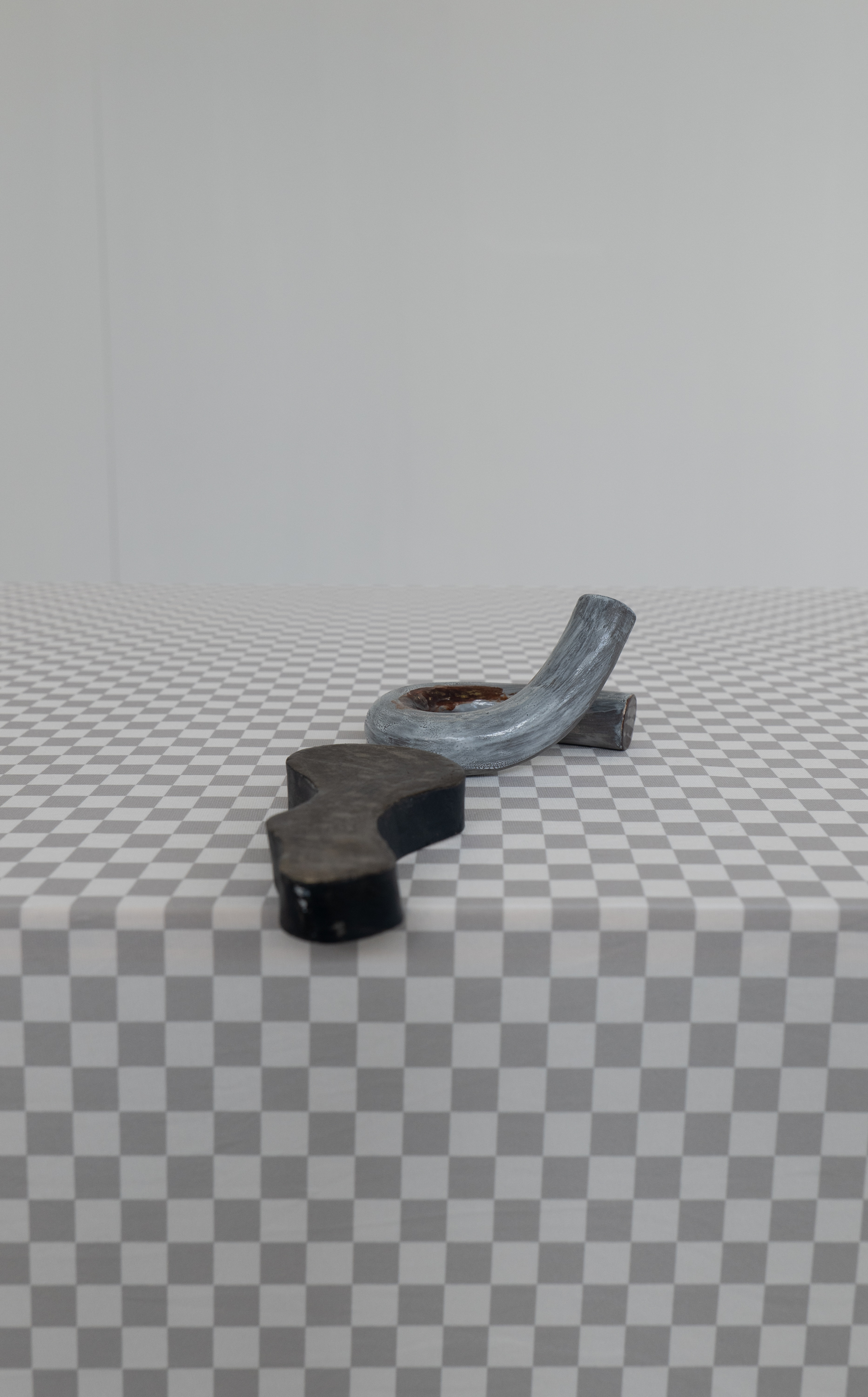 2021, installation, céramiques émaillées, tissu polyester imprimé, plateaux en bois, pieds en aluminium et papier autocollant (env. 100 x 450 cm)