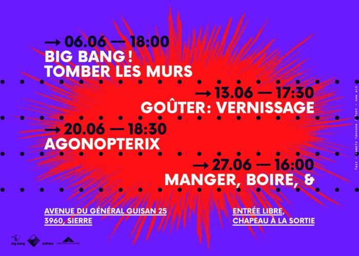 Fondé par une association de jeunes artistes de l'EDHEA, big bang est un espace de réflexions et d’actions sur les infrastructures d’exposition et leur relation au public, avec la volonté de proposer des productions artistiques actuelles sur le territoire sierrois.